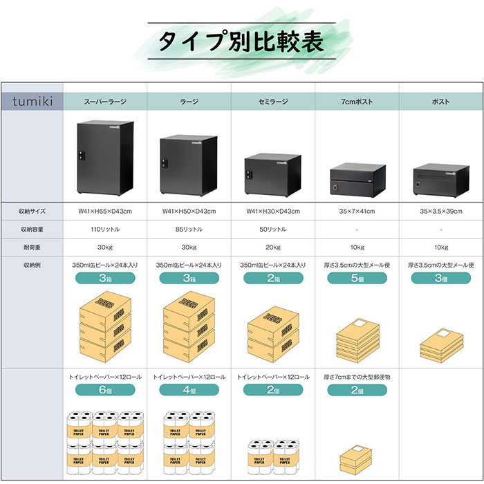 エスディエスの戸建て住宅向け宅配ボックス「宅配KEEPER」はスーパーラージ(110L)、ラージ(85L)、セミラージ(50L)の3タイプの宅配ボックス、厚さ7cm荷物に対応したポストと厚さ3cmまでの荷物に対応した2種類のポストを組み合わせて使用する宅配ボックスです。